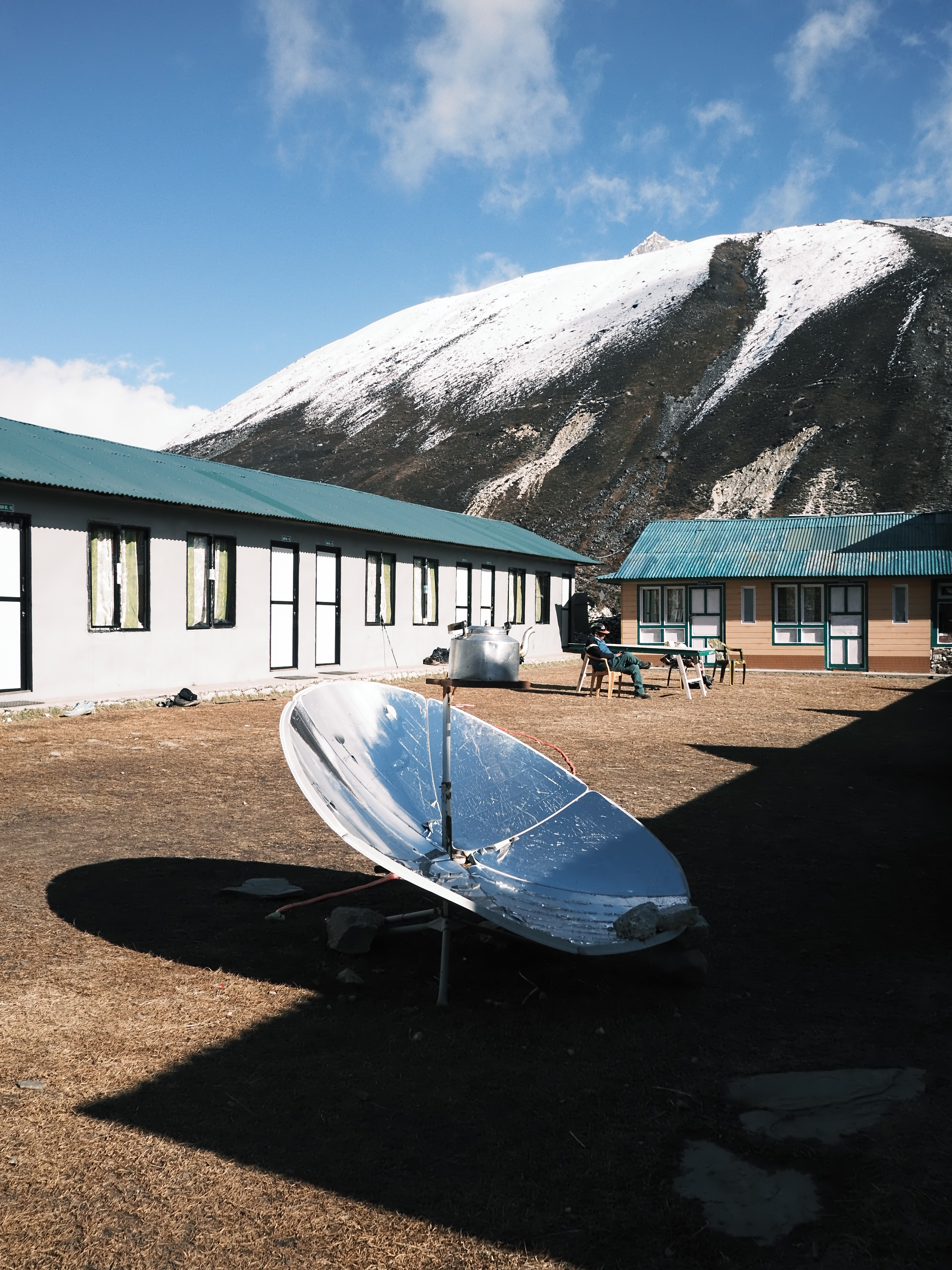 このあたりでよく見られる、太陽光を集めてお湯を沸かす装置。アナログなはずなのになんだか近未来的。