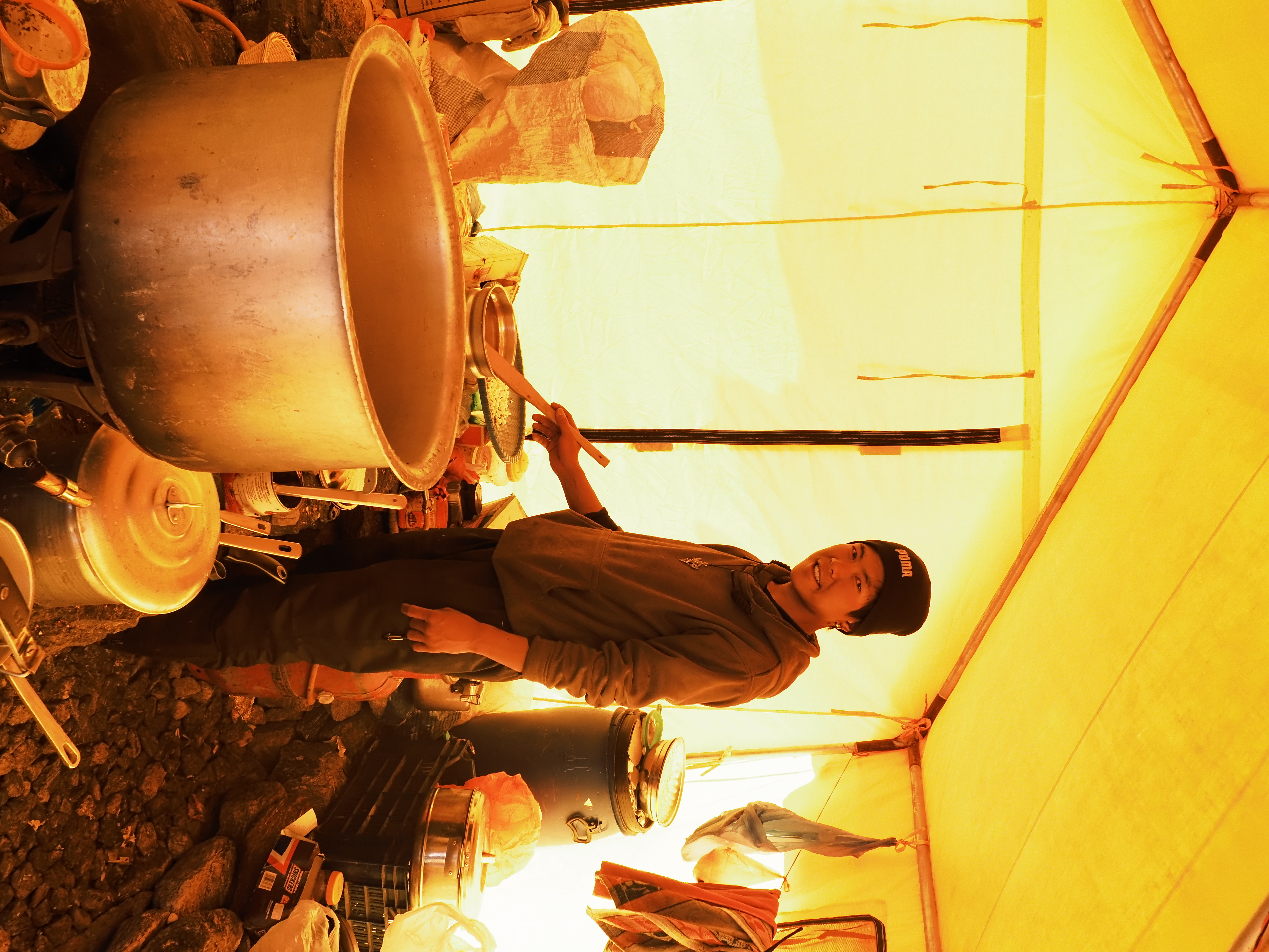 ポーターのパサン(左)はハイキャンプで待機していたが、なかなか戻ってこない私たちを心配して雪道を上がってきてくれた。右手にミルクティーの入った魔法瓶、左手にオレオとステンレスカップが入った赤いビニール袋を持った姿は、まるで救世主のようで忘れられない。彼は無事に登頂した私たちを労い、次々とオレオの袋を開け1枚ずつ手渡し、まだ空になっていないカップにおかわりのミルクティーを注ごうとした。こんなに幸せなティータイムは初めてだった。こうして、ふたりのおかげで無事にハイキャンプまで降りることができたのだった。