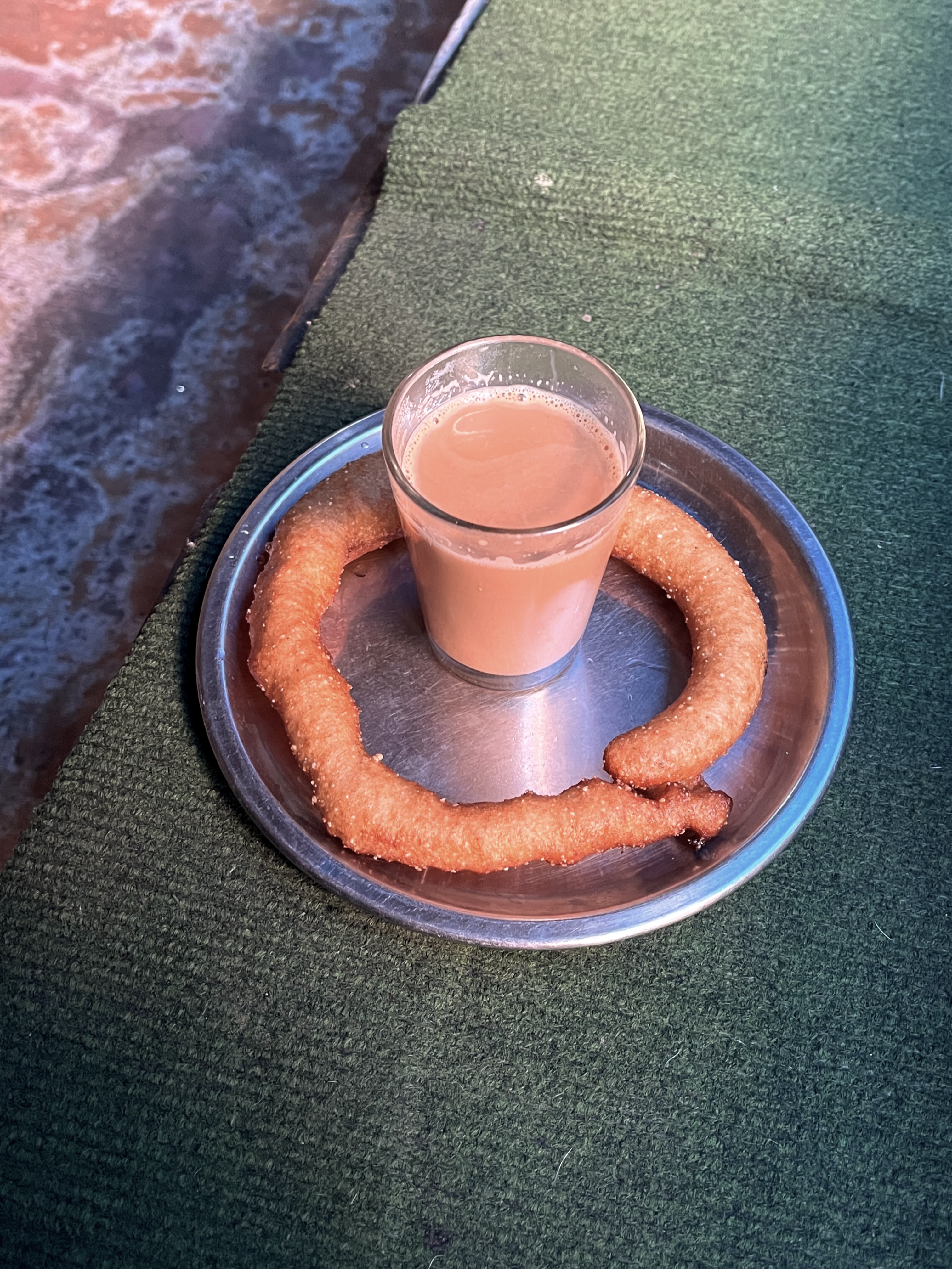手前にある丸いのは甘くないドーナツ。砂糖をたくさん入れたミルクティーと一緒に食べるとおいしい。
