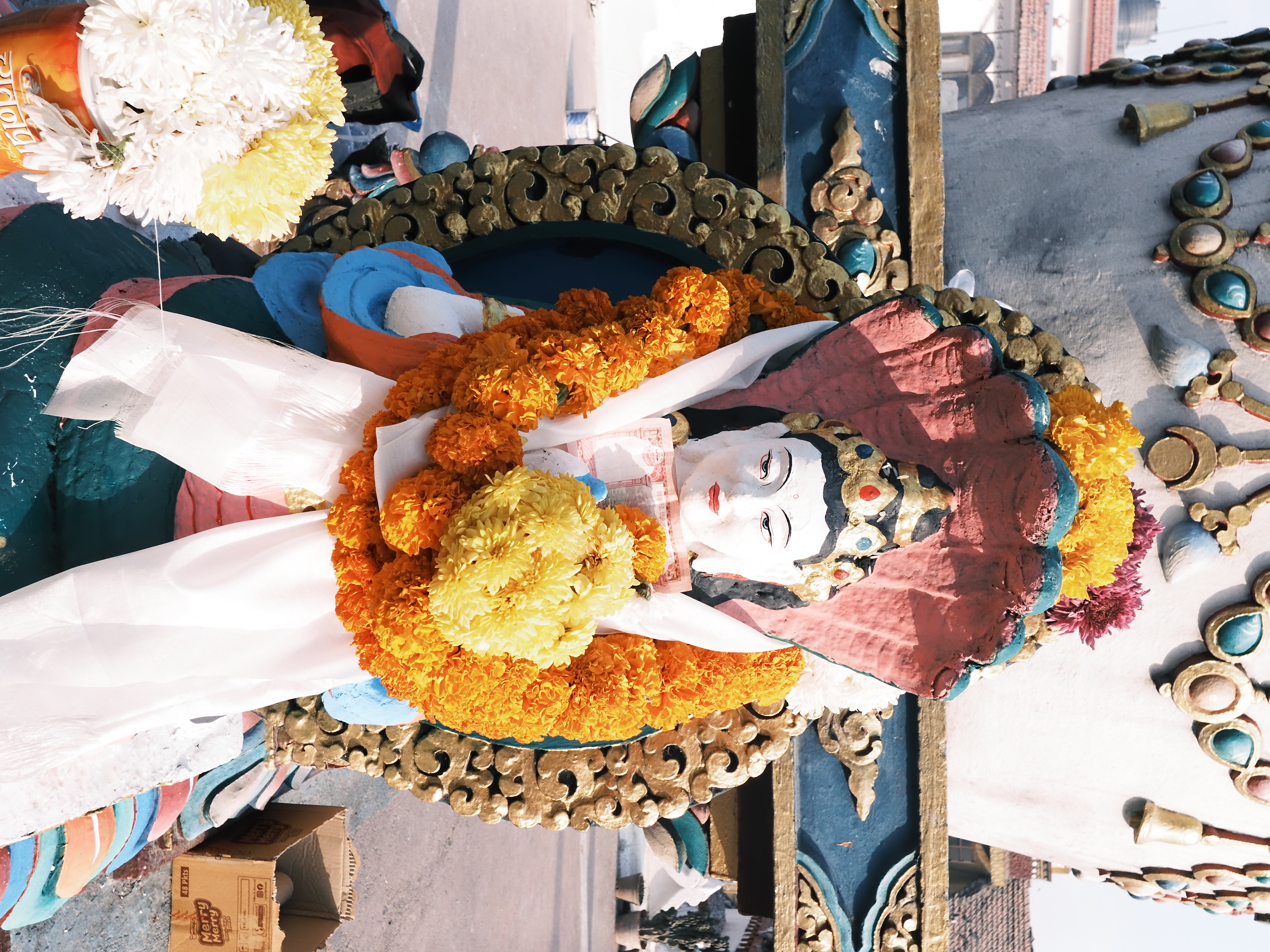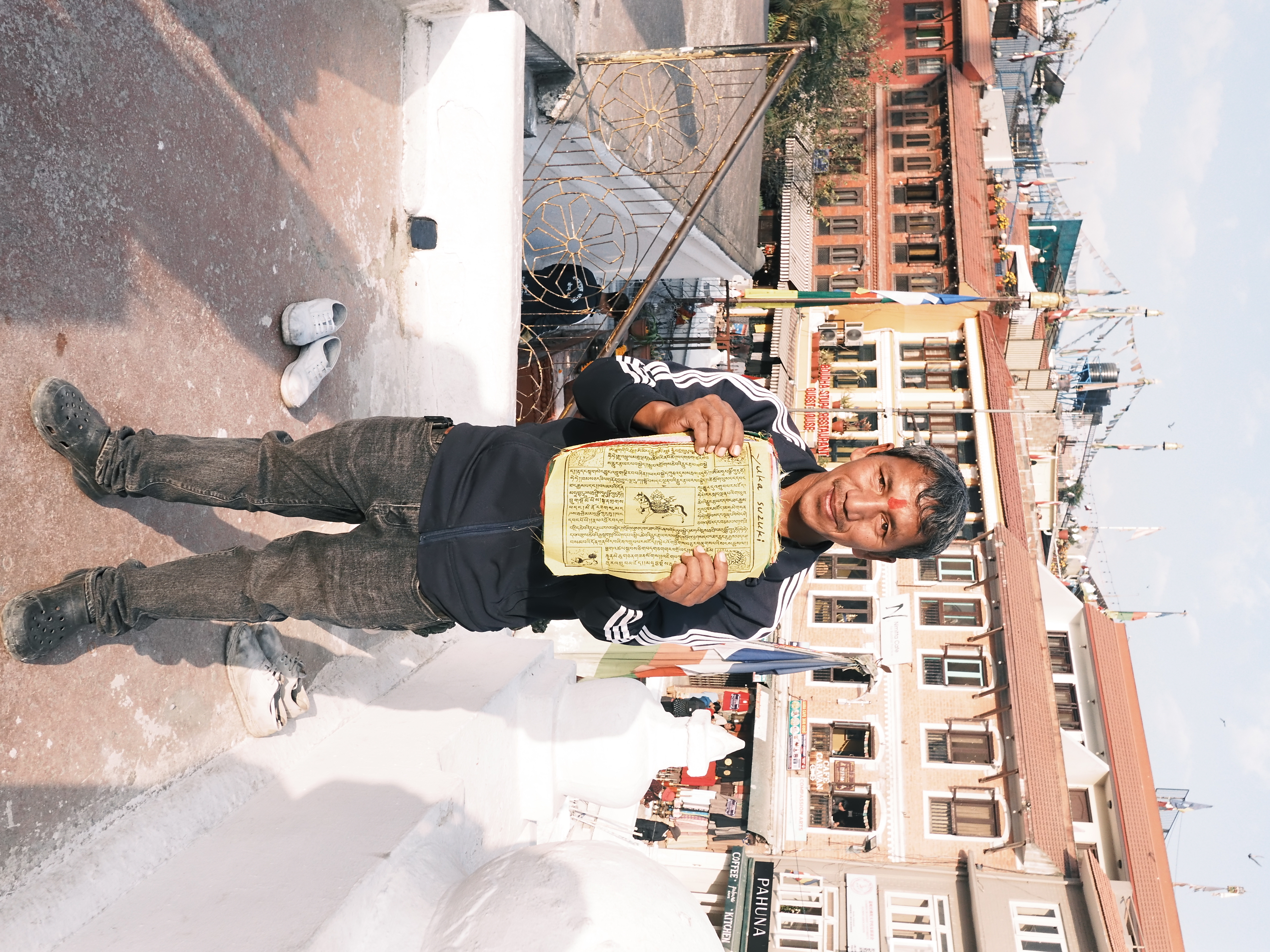 朝の散歩に出かけると、今年の夏にも会ったお兄さんに再会。前回はお供えのマリーゴールド、今回はストゥーパ(仏塔)に掲げるタルチョ(5色の旗)を勧められたので購入。名前を書いて願い事を込めた。