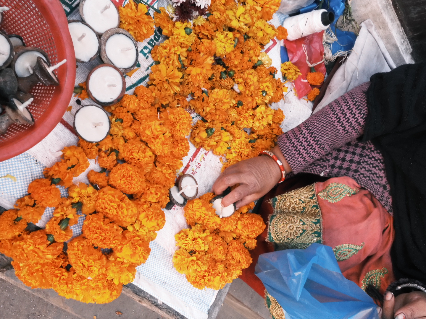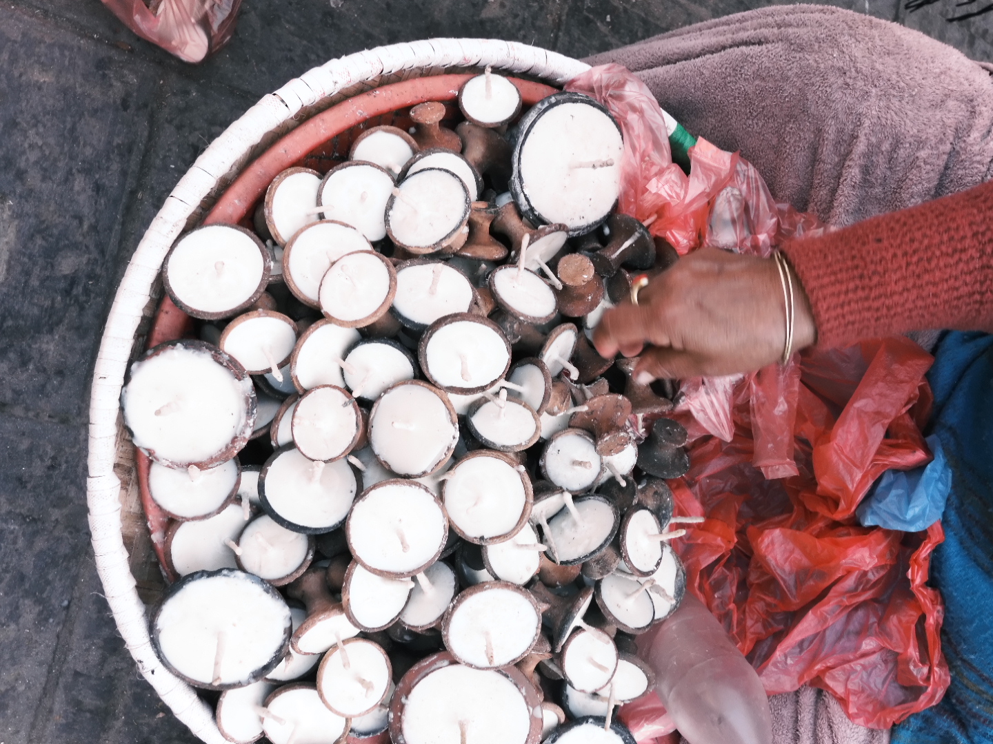 道端で売られているお供えのためのキャンドル。個体差のある素焼きの台が可愛くて、ついたくさん買ってしまう。