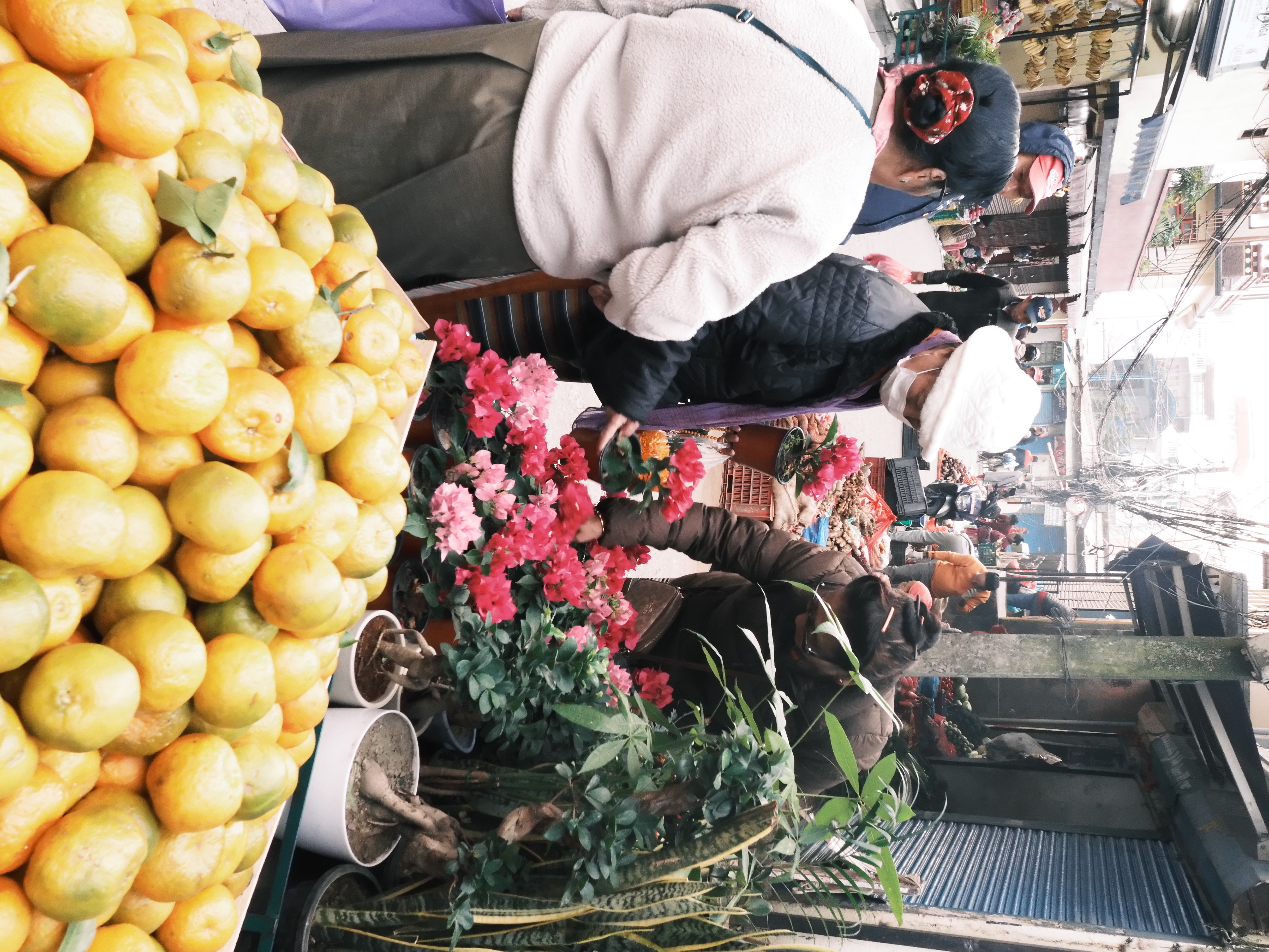 近くの市場に来ていた移動式のお花屋さん。花好きの女性たちはブーゲンビリア選びに夢中。