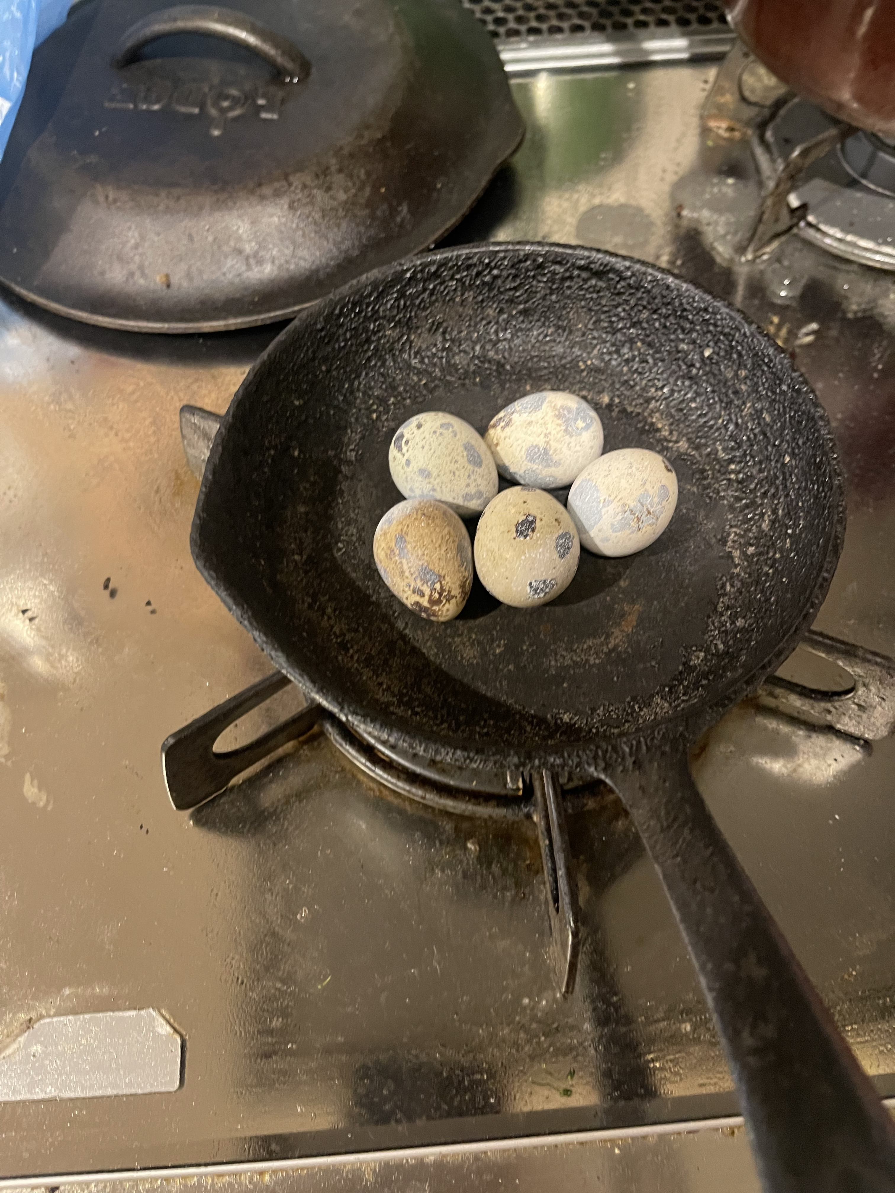 アウトドアで人気の料理道具といえば、鉄板よりもメジャーなのがスキレットでしょうか。100円均一ショップでも“100スキ”として販売されているので、手に入りやすいのも魅力です。その小型スキレットを活用したレシピは世の中に数多くありますが、最近私が出会った衝撃レシピが、うずらの卵を殻ごと焼く——という、焼くというより“炒る”に近い調理法でした。