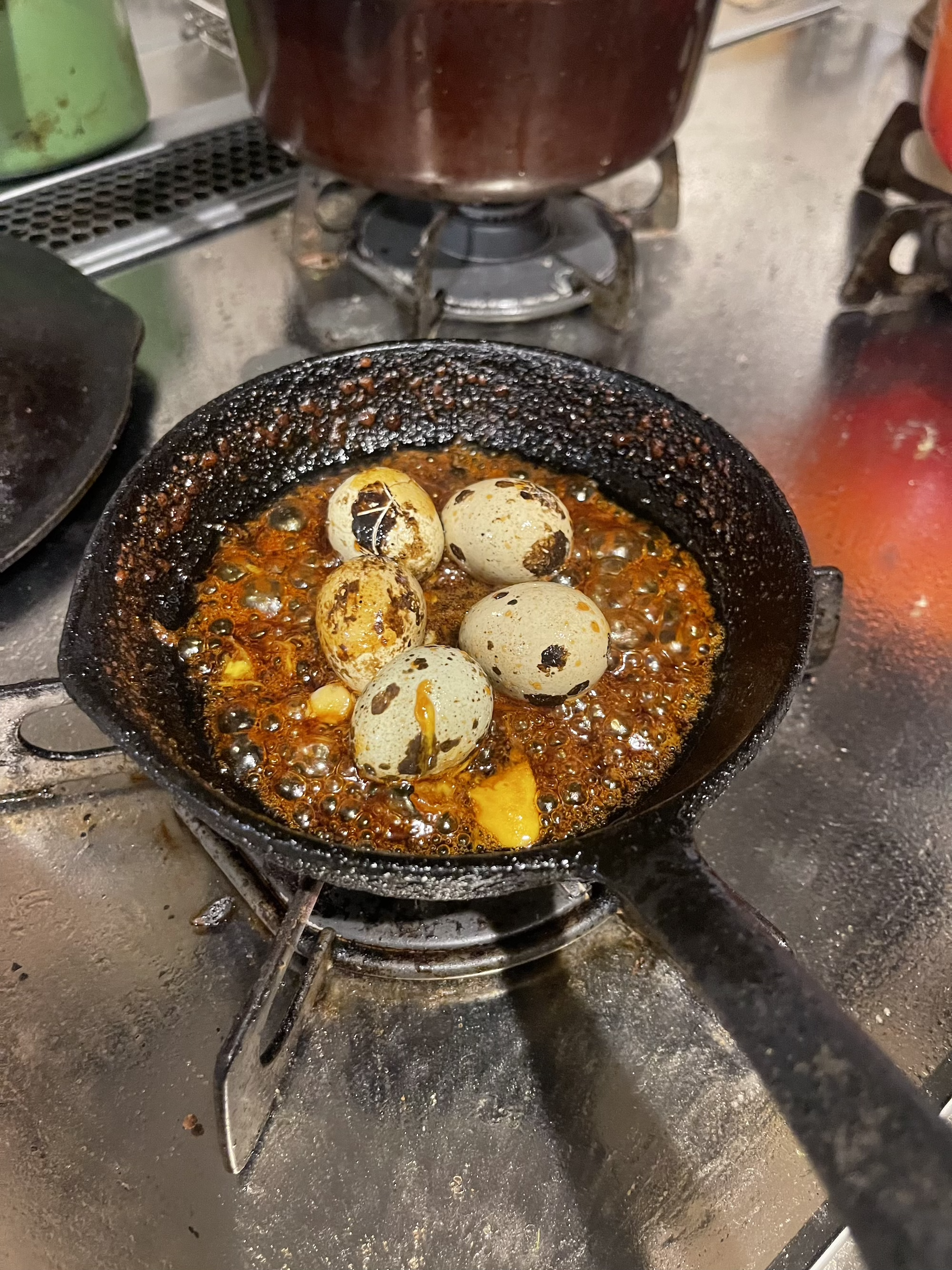 よく洗ったうずらの卵をそのままスキレットに入れ、醤油・みりん・砂糖のいわゆる甘辛系で味付けするだけ。以上です。