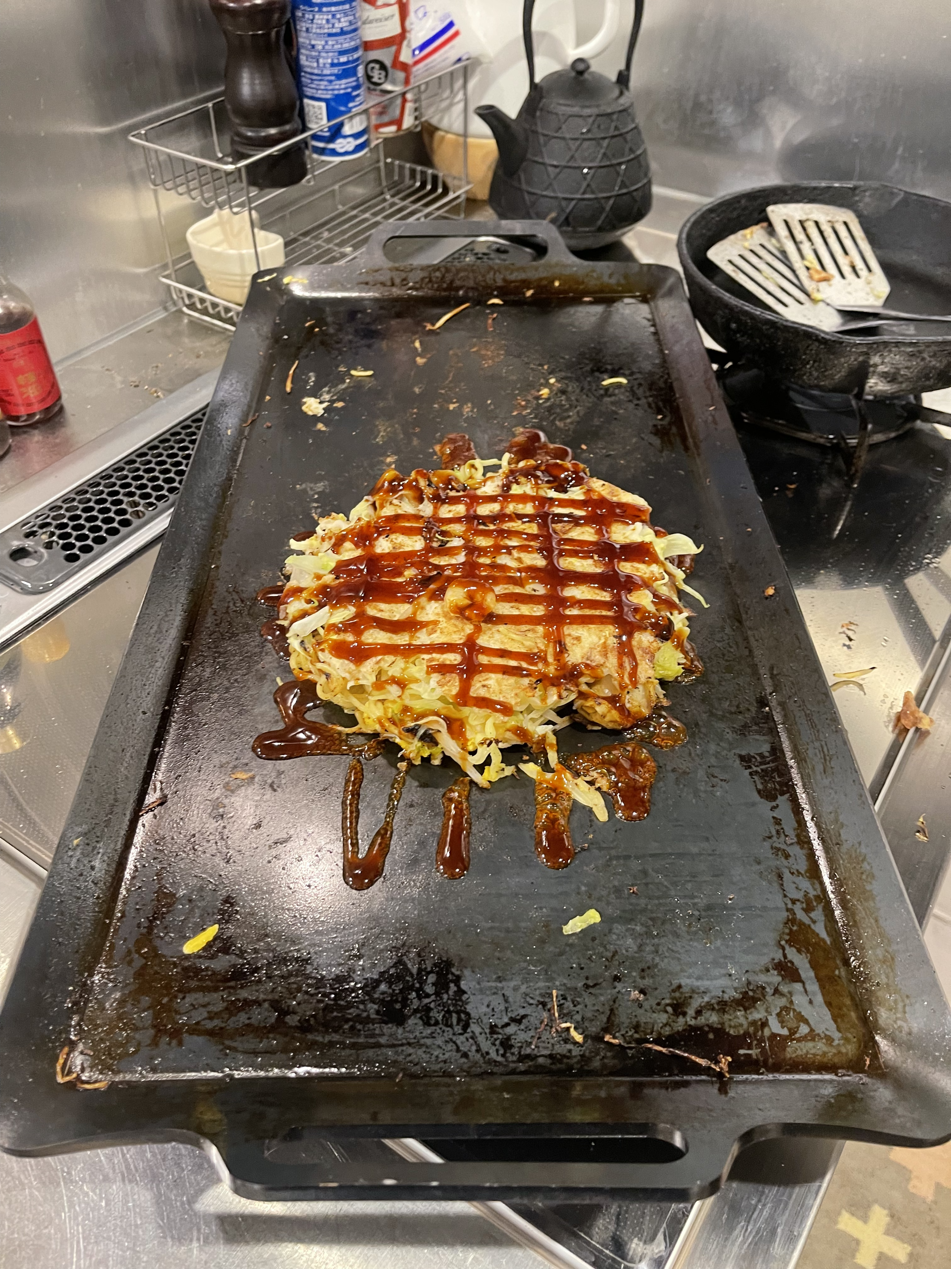 そんなソウルフードのお好み焼きということもあって、自宅でもよく作ります。実は味にもそこそこ自信があり、友人を家に招いたときは、ちょくちょく振る舞わせてもらっています。ついに道具にもこだわり始めて、これまではホットプレートで焼いていたのですが、ここ数年は鉄板を使っています。横幅約60cm、奥行き約30cm、厚みも5mm以上の特大鉄板を三つ口ガスコンロにドンと置いて、即席の“お好み焼き専用鉄板キッチン”を使うようになって、味のクオリティも上がりました。やっぱり道具に頼るのは重要ですね。