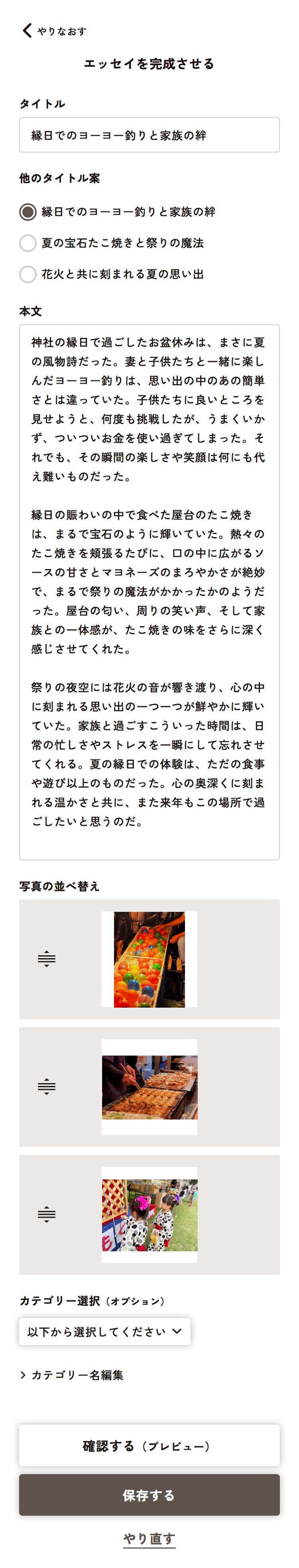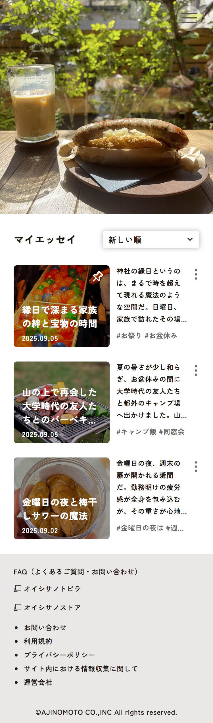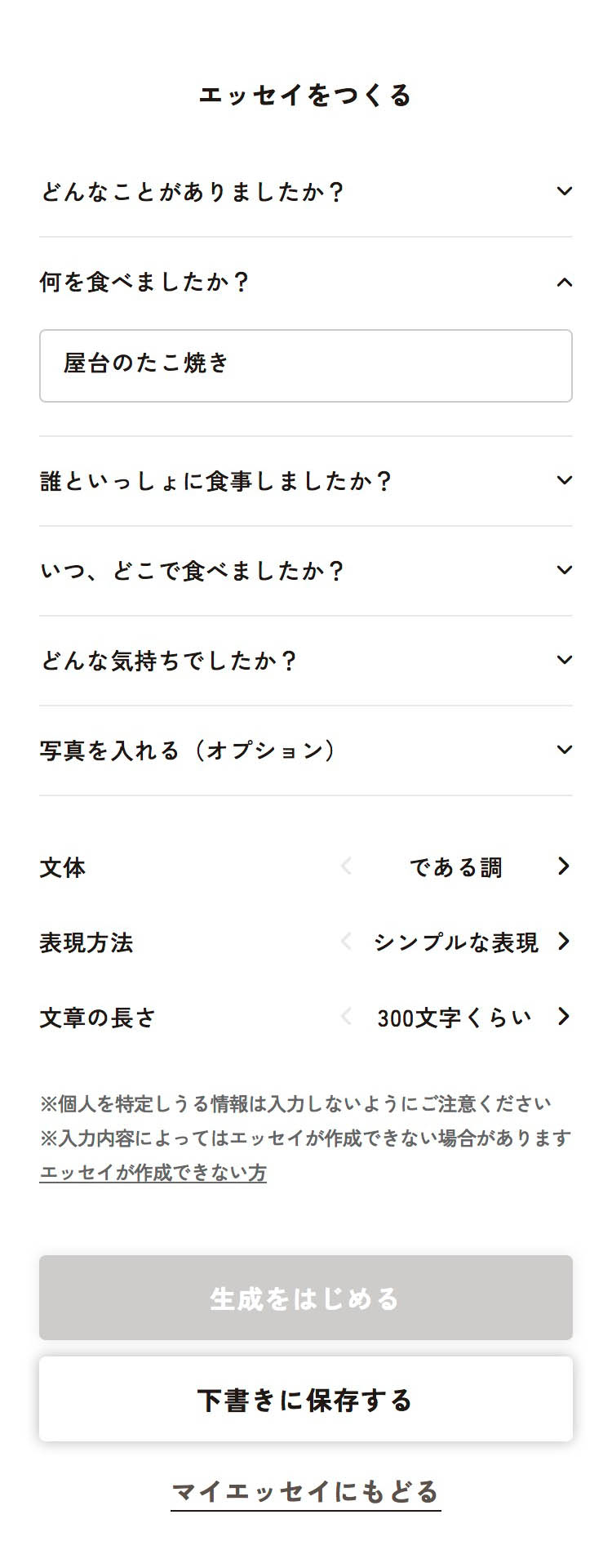 その日の気持ちや、その日の食事のことを文章に。 あなたのことばをヒントに、AIがエッセイを作成します。 SNSよりも気軽で、日記よりも手軽に。 あなたのオイシサノトビラをはじめてみませんか。 AIエッセイの使い方 ログインAJINOMOTO IDではじめることができます。 マイページ作成したエッセイをいつでも楽しめます。忘れたくない思い出を文章で残しましょう。 かんたん入力AIがエッセイをつくるための質問です。写真も入れてAIにイメージを伝えましょう。 かんたん編集生成された提案を編集して、あなたらしいエッセイにしましょう。